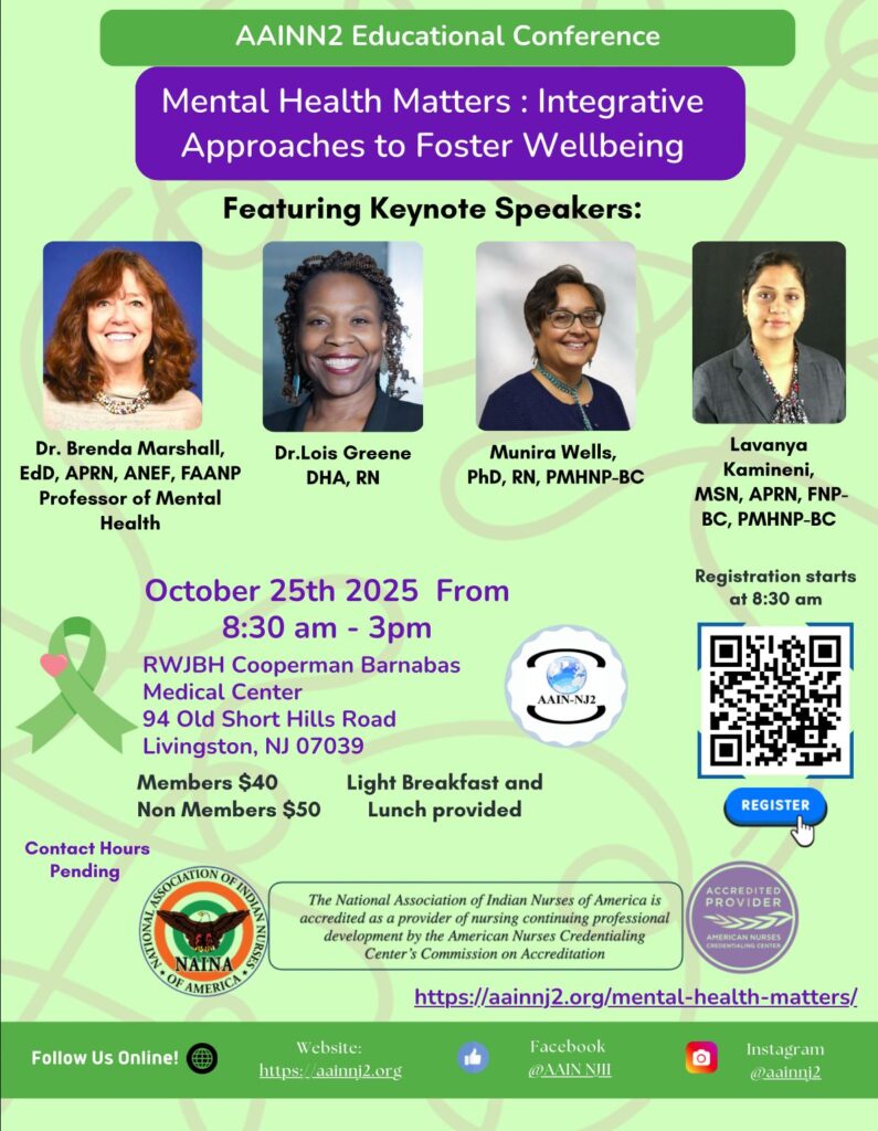 Greetings from AAIN-NJ2! As we end this year, I want to thank all of you for giving me the opportunity to serve as your President. It has been two years of so much energy, engagement and empowerment. We have been here, there and everywhere. From local chapter activities to the national conferences, supporting our state organization (NJSNA) and other professional organizations, to reaching across oceans and helping nursing students and the needy in India, we did it all! Every year, we take more steps forward, increasing our footprint in the world of nursing.